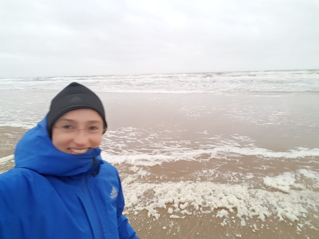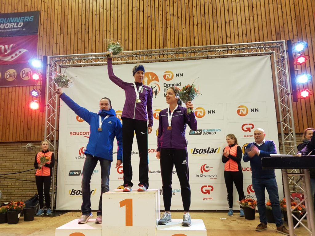 Om 12.16u klonk het startschot, met een selecte groep dames gingen we aan dit avontuur beginnen. Ik startte niet hard, althans dat vond ik, maar ja wat ik al zei; “wind mee en naar beneden”. En dus lag ik, zonder het door te hebben al voordat we het strand opgingen (binnen 500m) los. Bram, mijn trainer riep nog: “niet te gek hè?!”. Oh, maar dat valt wel mee dacht ik. Maar op het strand liet ik toch eventjes het tempo zakken. Eventjes, want ze kwamen me niet snel genoeg en de wind stond m.i. prima om alleen te lopen en dus liep ik op een comfortabel ontspannen tempo over het strand. Achteraf hoorde ik dat in de groep achter mij niemand op kop wilde lopen en het tempo gedrukt werd. Ik dacht alleen maar, “dit is mijn kans, uitbuiten waar je goed in bent.” Ik genoot met volle teugen en liep zeker weten niet op het randje, maar liep wel verder uit op de groep. Prima, want die voorsprong verwachtte ik op de wind tegen stukken wel nodig te zijn. Ik geloof dat de eerste Afrikaanse dames mij op 12 of 13km voorbij kwamen. Natuurlijk probeerde ik even aan te haken, maar hun loopvermogen was toch een beetje beter dan het mijne. Niet veel later kwam de derde en laatste Afrikaanse me voorbij. Ik bleef gewoon m’n ding doen. Goede cadans lopen, vooral profiteren van de windluwe of windmee gedeelten en zo goed mogelijk hoog ritme lopen tegen de wind in. De wind was echter te sterk, soms kon ik m’n lijn ook niet houden. Knap van die Afrikaanse dames die niet veel zwaarder dan mij zullen zijn. Op 16, 17 of 18km kwam Ruth van der Meijden mij bijhalen. Natuurlijk haakte ze eerst even aan. En ik wilde niet laf zijn dus bleef gewoon lopen, ook tegen mijn vriend “de wind”. Met een korte maar goede versnelling pakte Ruth een gaatje op mij, zoals dat vaak bij mij gaat moest ik even schakelen voor ik hierin mee kon, maar daarna kon ik het gaatje weer iets dichten, tot we de Bloedweg opgingen. 6% klimmen en vol tegen de wind in. Ik kwam nauwelijks vooruit. Ik gaf me echt niet zomaar gewonnen, ondanks dat die laatste kilometers best veel wind tegen was. Wat best veel? Heel veel, vooral dat laatste stuk. Logisch want met de start gingen we deze weg tegengesteld en was hij mee. Het was dus zwaar die laatste meters. Tel daarbovenop dat ik, zij het heel bewust, nog weinig hardloopkilometers heb gemaakt. Die combi voelde ik aan het einde vooral. Maar niet getreurd. In tegendeel! Ik ben zeer tevreden met mijn race. En al liep het bij toeval zo, eerlijk gezegd was dit scenario ook het beste wilde ik hoog eindigen vandaag.